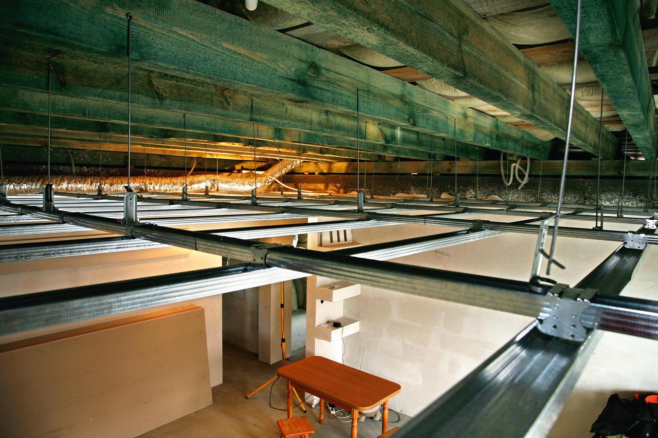 Aby nie przenosiło drgań na strop, powinno się je od niego odseparować. W tym celu najpierw wzdłuż belek mocuje się zszywkami pasy taśmy akustycznej (najlepsza jest ta z granulatu gumowego).